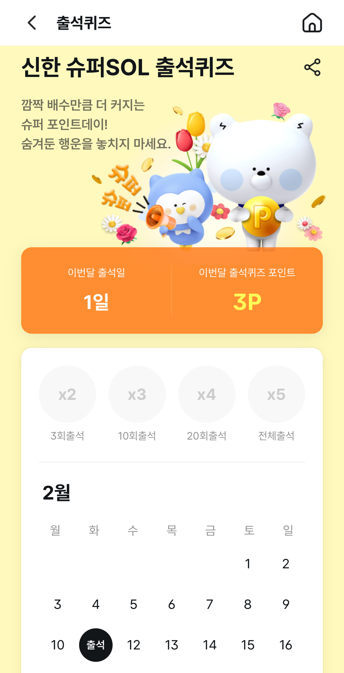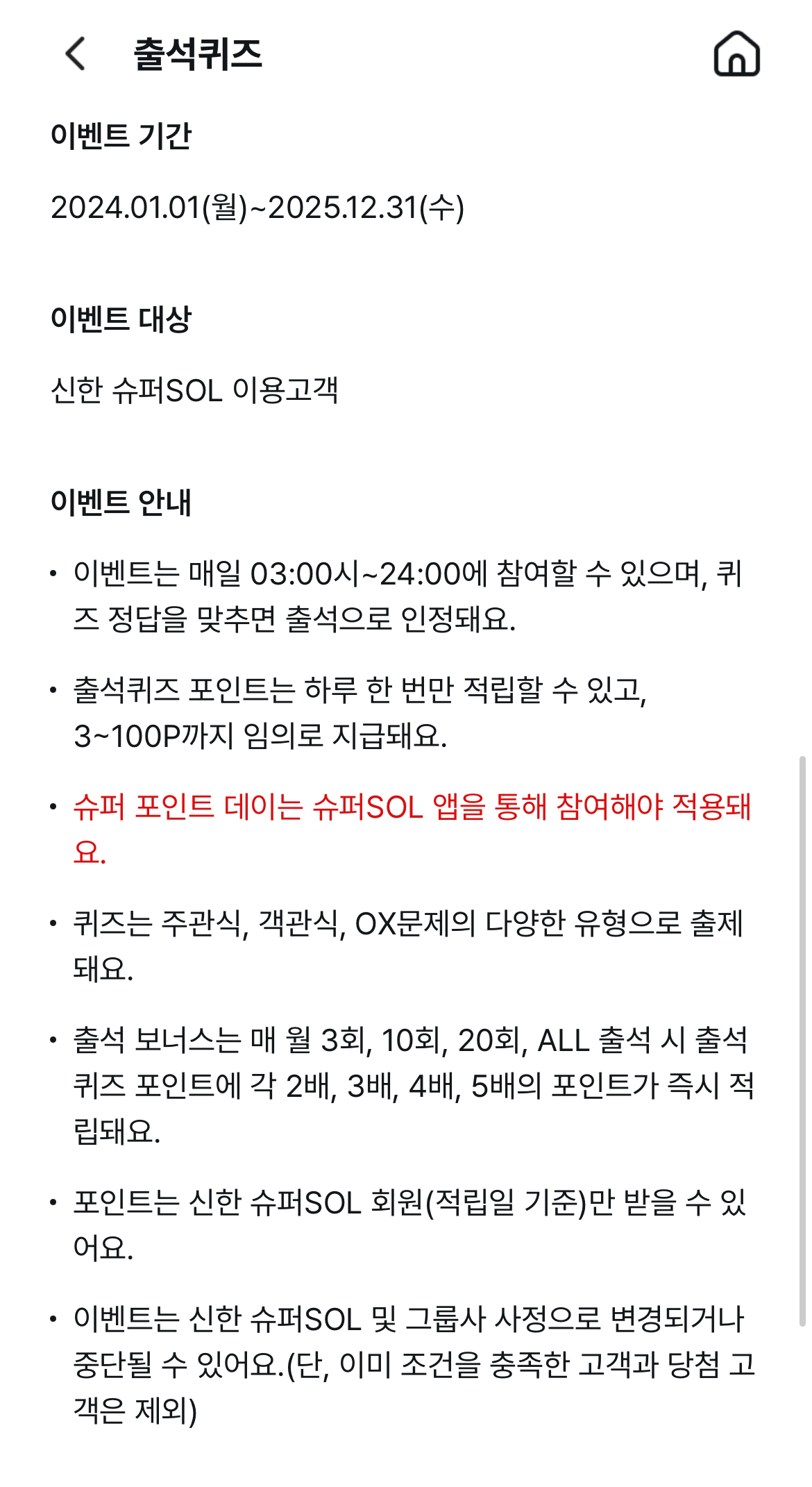 신한 쏠퀴즈 출석퀴즈(구 신한플러스 출석퀴즈) '신한 슈퍼SOL' 어플 홈 화면 하단 '포인트 모으기' 또는 하단 탭 '혜택' - > '포인트 더 모으기' - > '출석퀴즈'를 선택해서 참여할 수 있다. 슈퍼SOL 리워드 앱을 통해 신한쏠퀴즈까지 한 번에 참여하여 마이신한포인트를 적립할 수 있습니다.